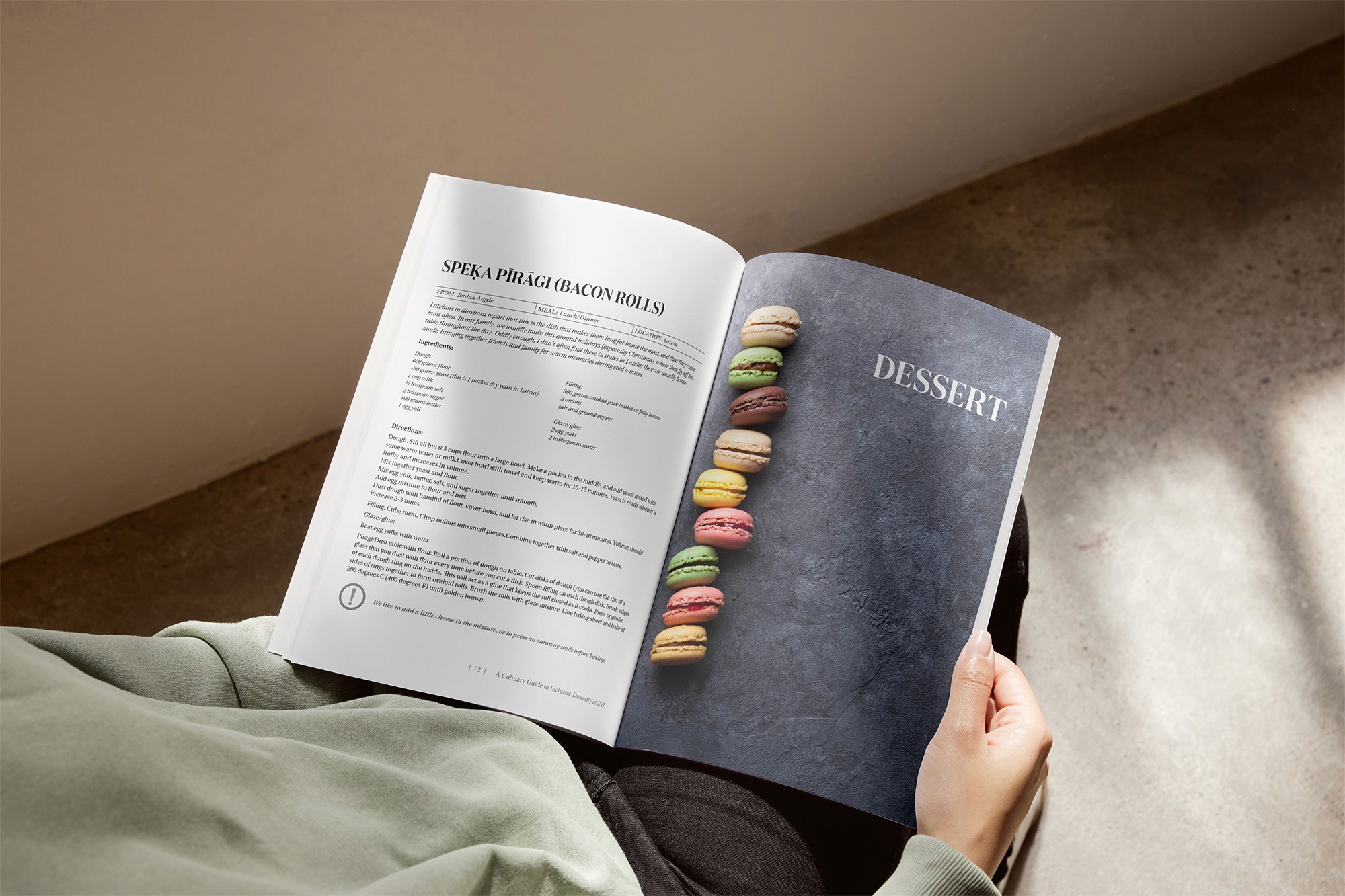After building the initial recipe layouts, I selected the photography to unify the visual story. The images shine throughout the book and help create a unified, cohesive look from section to section. I also designed cultural callouts to appear consistently across pages, bridging the introduction into the recipes and reinforcing the theme. Keeping INL’s message and goals front and center guided every styling and layout choice, so the final piece clearly connects culture, cooking, and the diversity INL brings to the table.