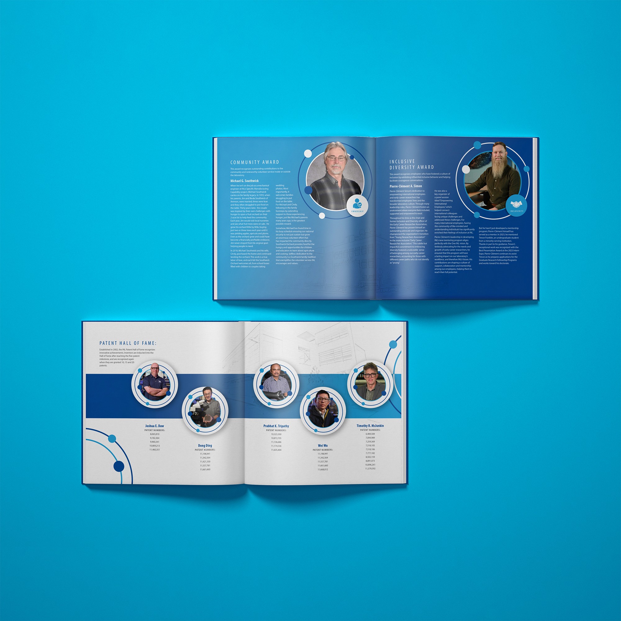 I focused on creating a clear visual narrative that supported INL’s 75-year celebration. The design balanced INL’s existing brand with the 75th anniversary mark, while still giving plenty of room to highlight the technology and, most importantly, the awardees. Throughout the program, photography stayed front and center to spotlight the winners and keep the event feeling personal and celebratory.