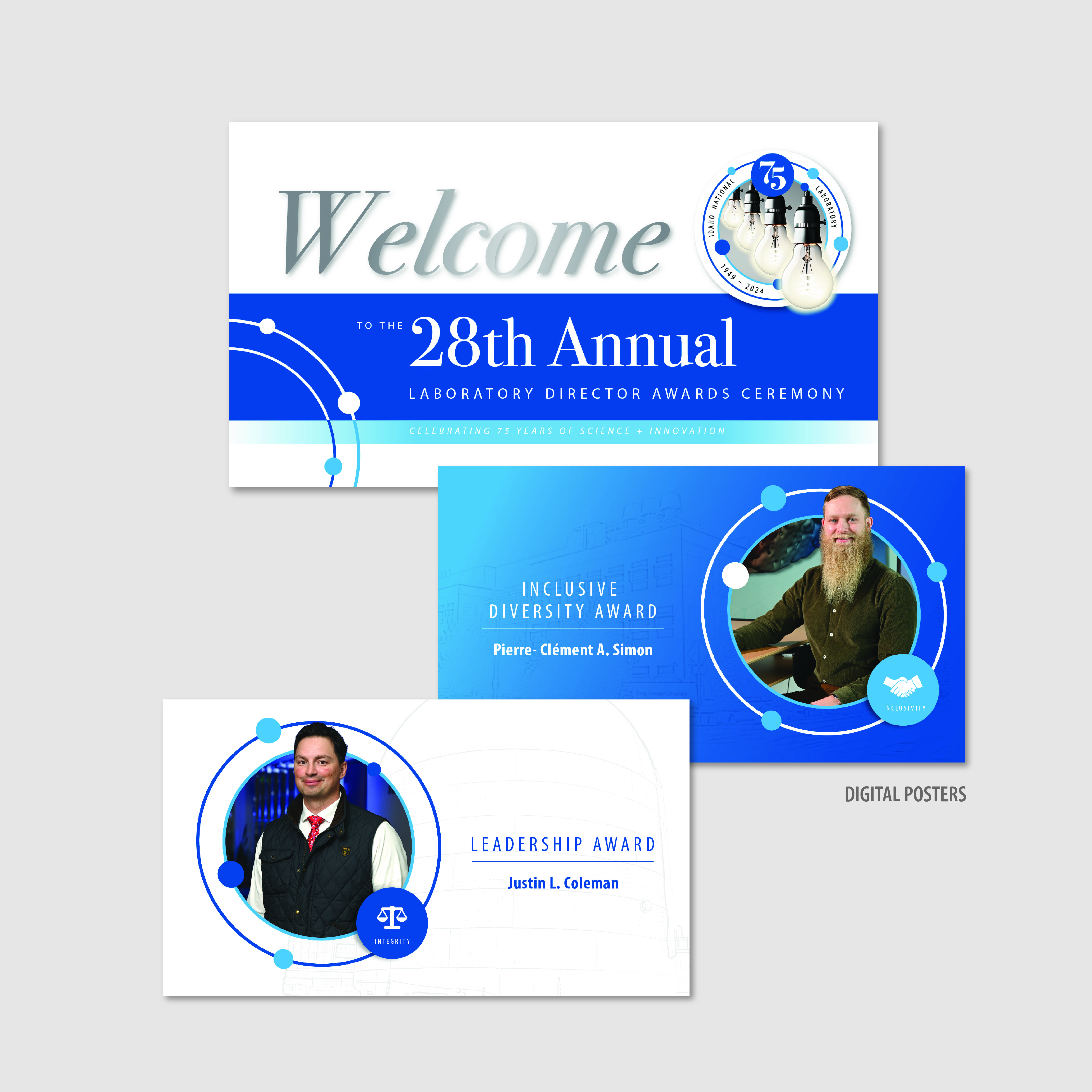 Create a cohesive set of on-brand event graphics that seamlessly integrated INL’s 75th anniversary identity while spotlighting the awardees throughout the experience.