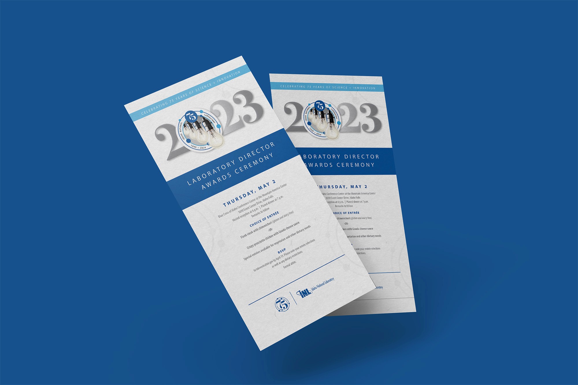 INL needed a cohesive set of Laboratory Director Awards materials that matched their current branding while integrating the 75th anniversary logo. I designed a 24-page program, directional signage, name tags, table numbers, and an awardee presentation, plus supporting items to keep the event polished and consistent across every touchpoint.